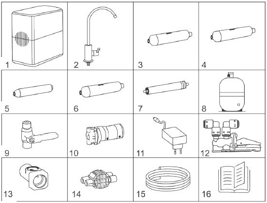 For the Spring Water non-pump water purification system to function, a minimum of 4 bar of mains pressure is required. In areas with insufficient mains pressure, a pump is added to boost the pressure. The mains water passes through the following stages in order: