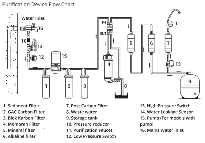 - The tank valve should be closed and the purified water tap should be opened. The plug should be plugged into the socket and the ball valve should be opened. The place where the waste line will go should be a drain line and should not be a place where there is an open front and accumulation. (It would be appropriate to connect it to the kitchen counter drain.)