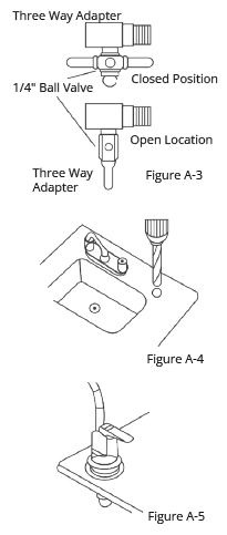- Mount the ¼ metal ball valve on the feeding water connection adapter (3-way adapter) by wrapping it with teflon tape so that it can be opened and closed easily. (Figure A-3)