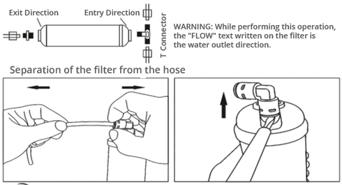 - Detach the hoses at the post carbon filter water inlet and outlet and take the filter out.