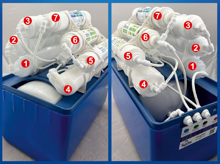 After installing the membrane, replace the cover and hose in the same way, open the tap to clean the newly installed membrane filter, run the system for 1 hour and drain the water, then you can drink the purified water.